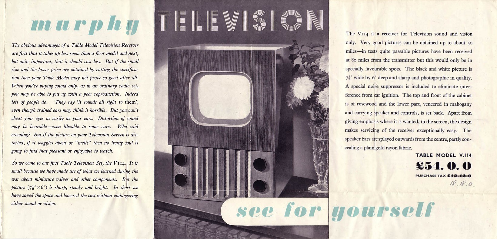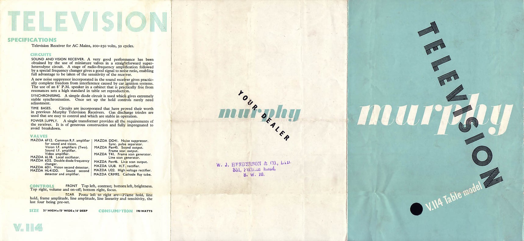 One of the first post WWII television receivers was the Murphy V114 from 1948. Images from the brochure are below and details are given of the valves and their function. .