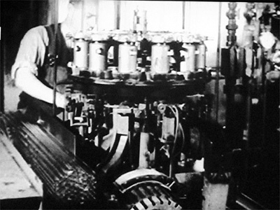 Mechanical blowing of glass tube, on the right is a gas ring used to control wall thickness.