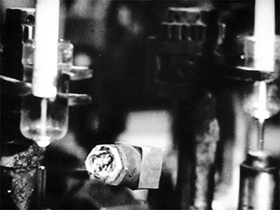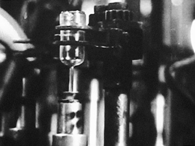 To make the valve envelope the stock lengths are fed into the envelope making machine. Here they are cut to short lengths, have the open end heated and flared and the other end of the tube is strongly heated and the resulting molten glass is pressed into a dome and closed pip.