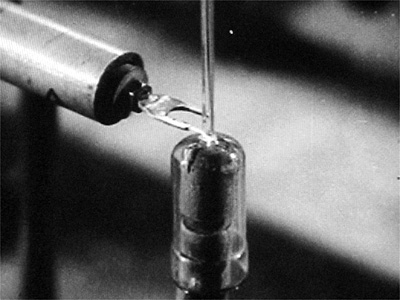 The pumping tube is formed separately and has to be joined onto the envelope. The envelope and the pumping tube are fed into a machine and clamped in position. The glass is heated from outside and then a needle jet of gas flame is inserted through the envelope to melt the pip at the top of the closed envelope dome. This in turn fuses the two components together.