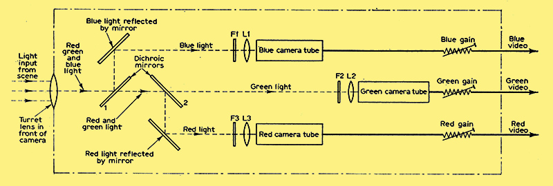 The red light from the second dichroic mirror is reflected through 90° by a second mirror and is directed to the 'red' camera tube through the red filter F3 and the focusing lens L3 and, as before, the red separation of the scene is projected on to the tube.