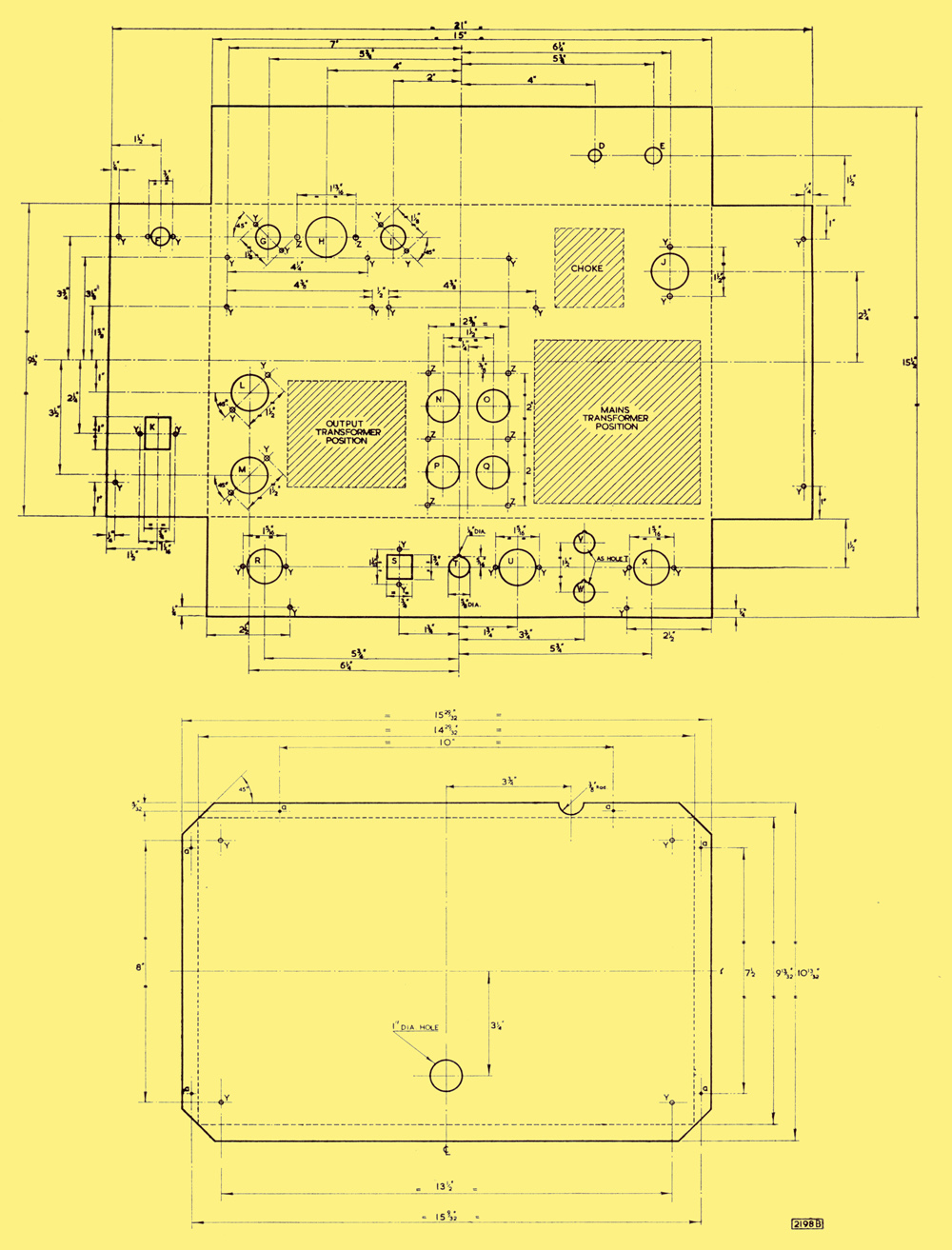 The chassis for the 20 W amplifier are made from two separate pieces of 16 SWG brass or steel sheet. The dimensions (in inches) of these pieces are: