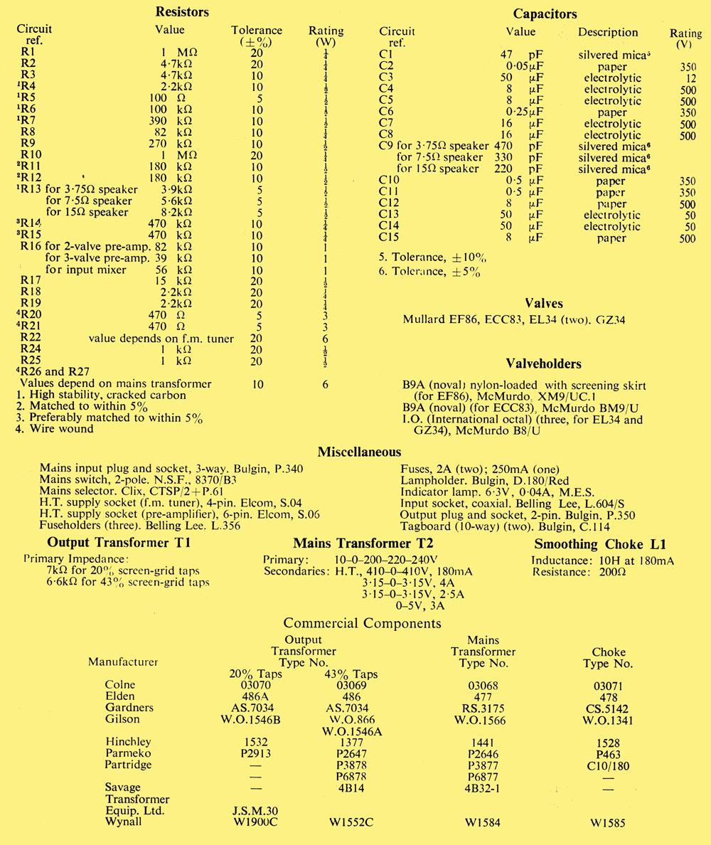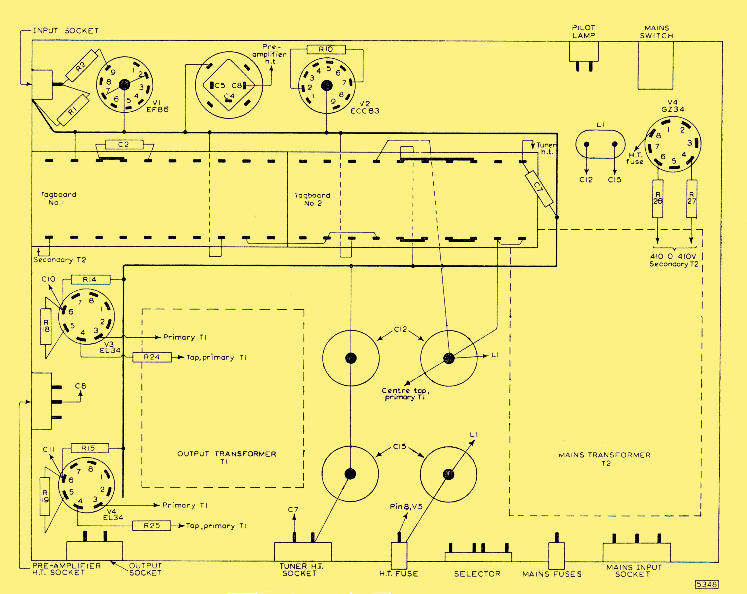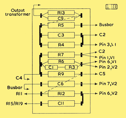 The wiring between the components is also indicated in the above diagram. A busbar earth return is indicated, with only a single chassis connection at the input socket. Of the valve holders fitted to the chassis, only the holder for the EF86 needs to be skirted. This holder should also be nylon-loaded.