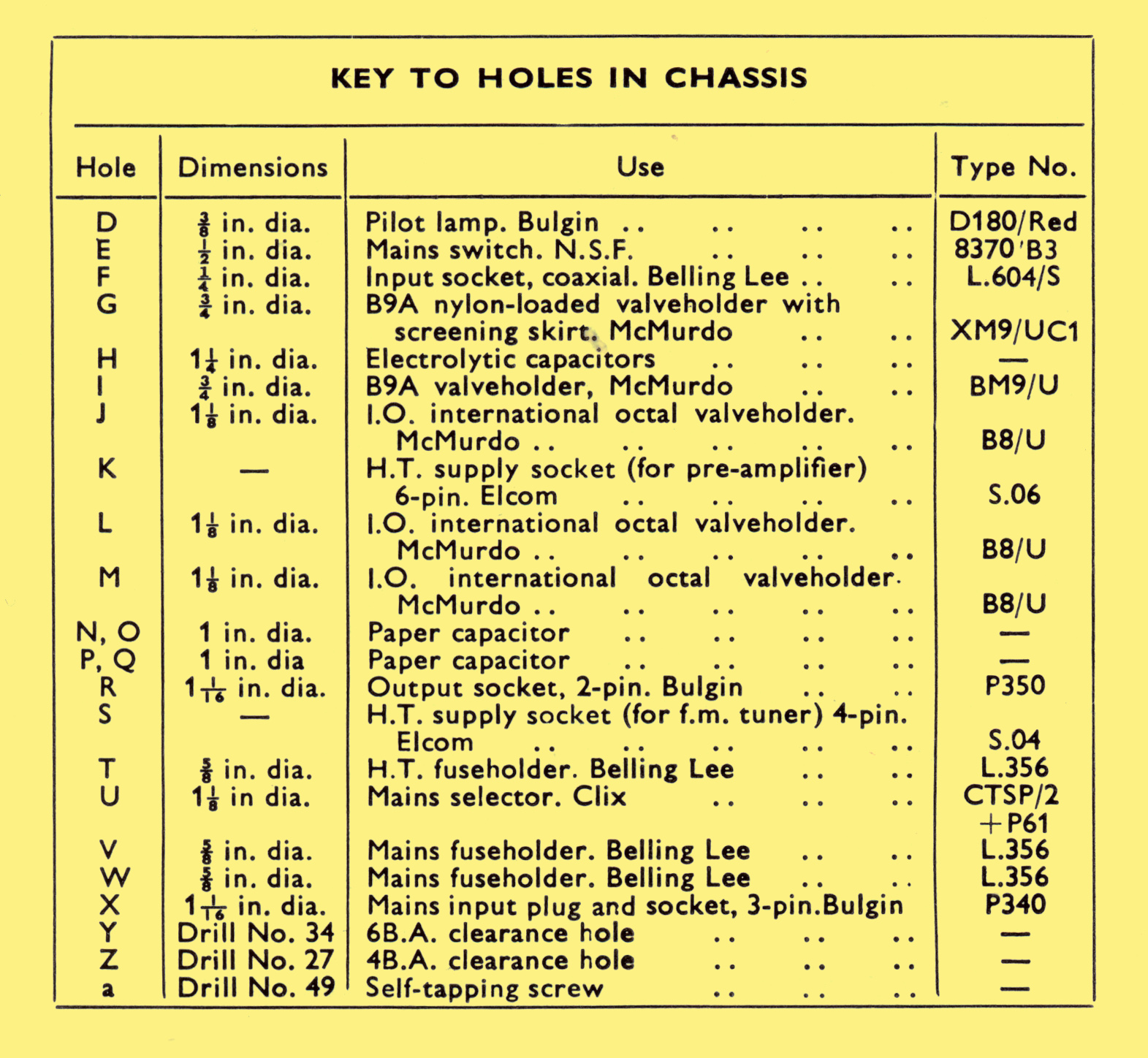 Each piece should be marked as shown in the drawings above and the holes should be cut as indicated in the table below. Where bending is required, it is important for the bends to be made accurately at the lines for the pieces to fit together properly on assembly. Most of the resistors and small capacitors are mounted on two ten-way tag-boards, and they should be connected as indicated above. The larger components should be fitted to the chassis in the positions indicated in the layout diagram below this arrangement of the components will ensure good stability.