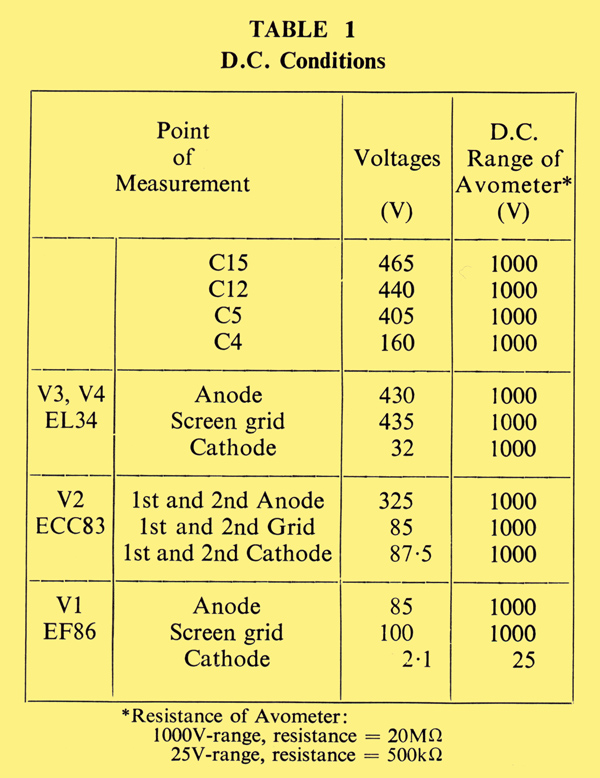 The DC voltages at points in the equipment should be tested with reference to table 1 above. The results shown in this table were obtained with an Avometer No.8. (20,000 ohms per volt).