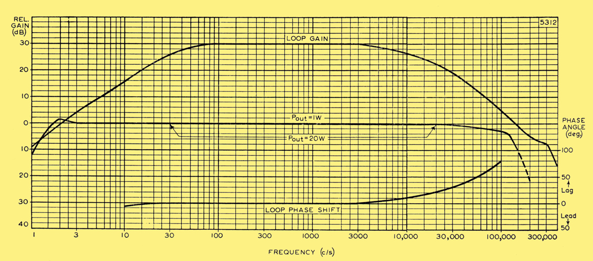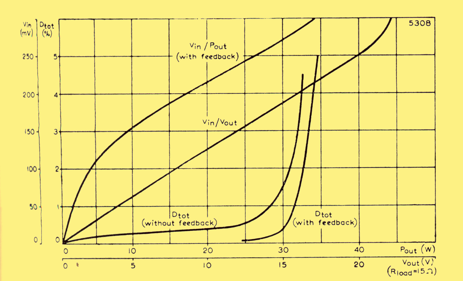 The total harmonic distortion of the prototype amplifier at 400 Hz, measured without feedback and with a resistive load, is shown above. The distortion curve towards the overload point when feedback is applied is also shown in the diagram above. At the full rated output, the distortion without feedback is well below 1 % and with feedback is below 0.05 %. The distortion rises to 0.1 % for an output power of 27 W. The loop-gain characteristic is such that a level of at least 20 dB of feedback is maintained from 15 Hz to 25 Hz, and of at least 26 dB down to 30 Hz.