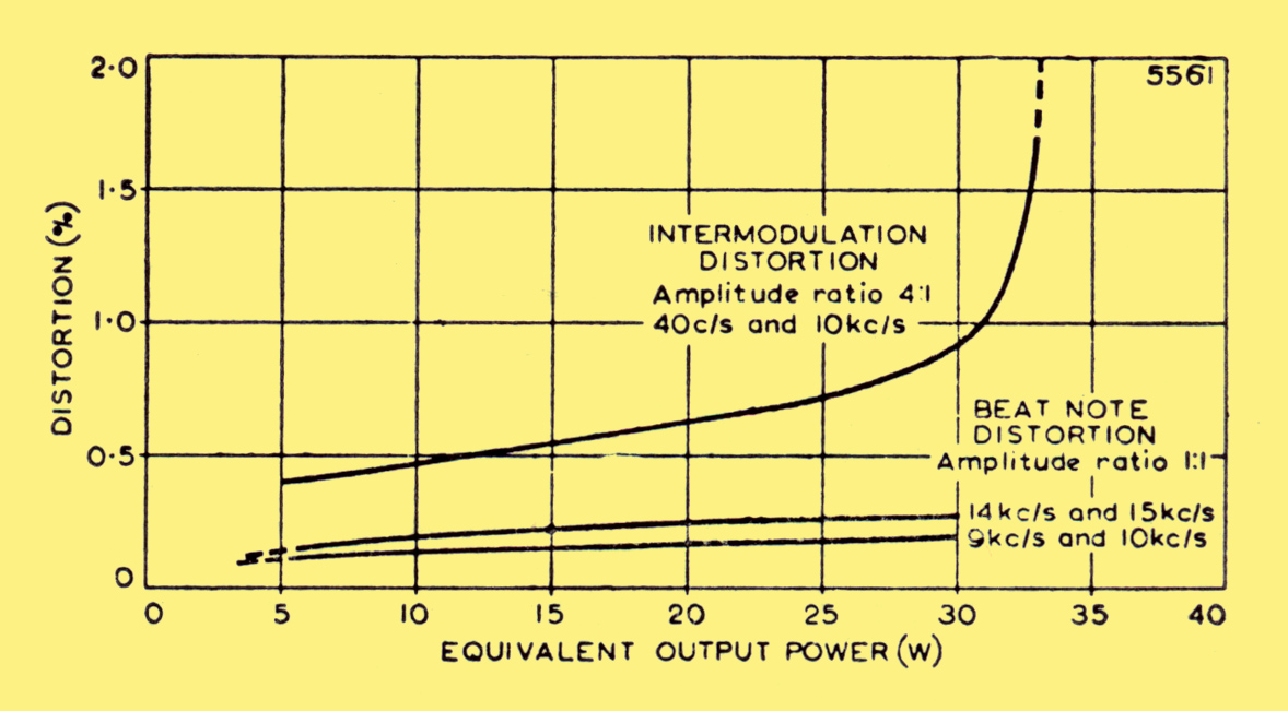Measurements of intermodulation products were made in the prototype amplifier using a carrier frequency of 10k Hz and a modulating frequency of 40 Hz. The ratio of modulating amplitude to carrier amplitude was 4 : 1. With the combined peak amplitudes of the mixed output at a level equivalent to the peak sine-wave amplitude at an RMS power of 20 W, the intermodulation products, expressed in RMS terms, totalled 0.7 % of the carrier amplitude. At an equivalent power of 27 W, the products totalled 1 % of the carrier amplitude. The beat-note distortion between equal-amplitude signals at frequencies of 14 and 15k Hz is 0.25 and 0.3 % at equivalent powers of 20 and 27 W respectively, and between frequencies of 9 and 10k Hz it is 0.2 and 0.25 % at the same equivalent powers. The variations of intermodulation and beat-note distortion with equivalent power are plotted in the diagram below.