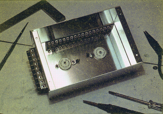 Underside view of experimental valve chassis, showing tag-strip for components and screw terminal block connector.