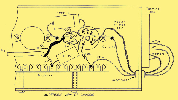 The HT connections were run so that one tag on the tag-strip was used for the +150 V supply, while the 0 V wire was taken directly to chassis by way of one of the solder tags, as shown.