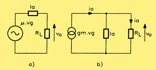 (a) constant voltage and (b) constant current equivalent circuits for a valve amplifier.