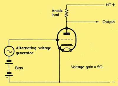 Above we have a triode voltage amplifier to whose grid is connected a generator. The valve is biased in normal fashion by means of a battery which is assumed to have zero internal impedance, and we shall state, for simplicity in the explanation, that the triode offers a voltage gain of 50.