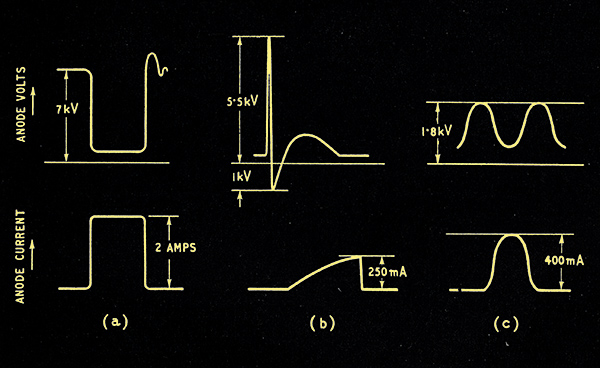 A pulse modulator is required to amplify voltage pulses from an earlier stage and to feed them into the drive circuit of a larger output valve. The load will be a coupling transformer and will be highly inductive. The operating voltage of the output valve may be quite high, often some thousands of volts, and this high DC voltage will have to be held off by the modulator during the quiescent part of the duty cycle. When the drive is applied the grid of the modulator is taken up to a high positive value and the peak anode current is very large. At the same time the voltage dropped across the load causes the anode voltage to fall to quite a low value. As soon as the drive is removed the anode current and voltage return to their original value, the inductive load often causing the voltage to 'overshoot' by a large amount unless an inverse diode is fitted. The electrical requirements of a pulse modulator are, then, that it shall operate at a high anode voltage, have a low impedance (otherwise the power loss when driven would be excessive), and be capable of a high cathode emission. Since the anode current must be zero during the quiescent period (when the anode voltage is very high), the valve must have a good grid control.