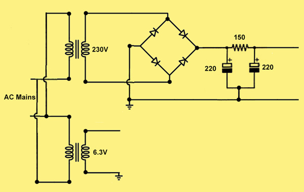 The heater circuit is AC with one side grounded. For the HT, the AC from the mains transformer is rectifier by a bridge rectifier, the black rectangle to the left of the right output transformer, and passed to a 220 μF 400 V reservoir capacitor. On load the voltage on the reservoir is 295 V. A smoothing filter consisting of a 150 Ω resistor and a second 220 μF 400 V capacitor generates the main HT rail of 286 Volts. A further filter of a 50 kΩ resistor and capacitor feeds the voltage amplifiers. The value of the capacitor, seen blue in the image, was not seen. This rail is at 213 Volts. The filtering is quite adequate as no hum has been detectable at normal listening distance in a quite room.