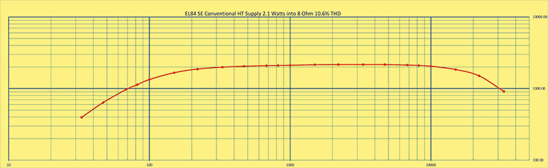 The curve above conveniently places the -3 dB points on the 1 Watt thick line. This gives a response of 70 - 30 kHz. The lower end is what the size of the output transformers suggests. The curve would be flatter with negative feedback but this would require more overall open-loop gain.