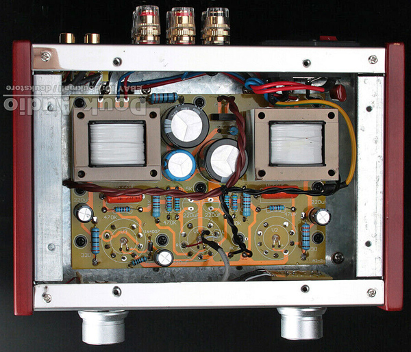 The bottom cover seems to have been fitted with air tools as the screws took a lot of force to move. A clear sign of production line assembly. Within the only difference from the advert was the layout of the AC wiring. The amplifier is built on a single double sided PCB and well made. The small output transformers mount directly on the board. The black cylinders above the chassis are the two mains transformers - HT and heater. The heaters are run from a 6.3 Volt supply as expected. The HT transformer outputs 230 Volts. In the image these are the brown wires.