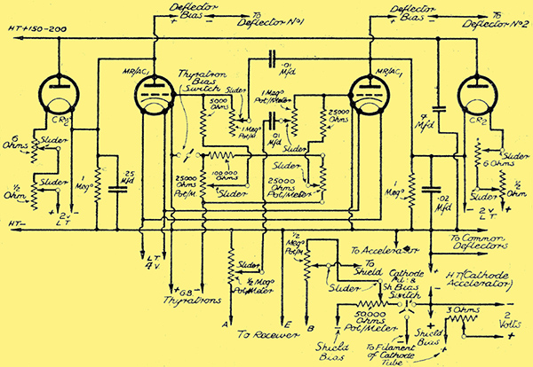 If you study the circuity given (it differs slightly in some minor features from the one given before) you will see that the two timebases each contain a diode valve (Ediswan CR2) and a thyratron (Ediswan MR/AC1). In addition, from anode to cathode of each thyratron is a capacitor across which is a resistance. These capacitors are vital parts of the circuits, for they are the capacitors that have to be charged and then suddenly discharged by the thyratrons.
