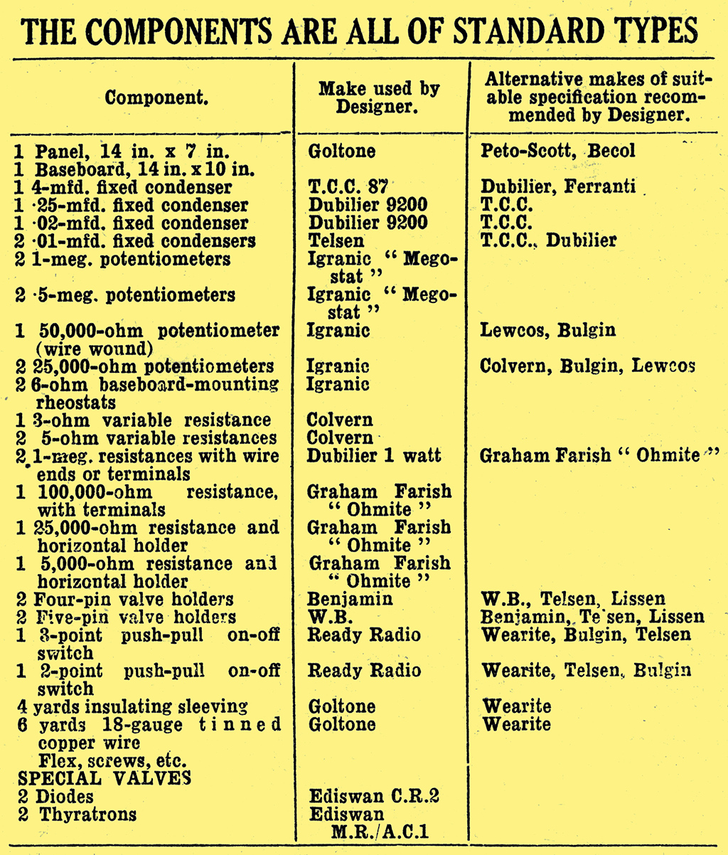 All parts used in the timebase should be of good, reliable manufacture, and constructors are strongly advised to keep to the makes specified in the list given below. The values, too, are critical and should not be altered on any account.
