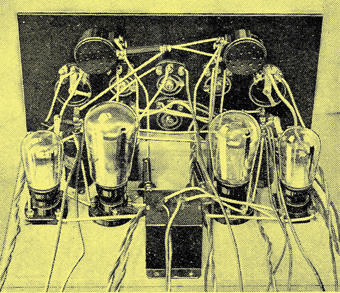The resistances in series with the filaments of the diodes are for 'coarse' and 'fine' adjustments, and the 6 Ω coarse ones are situated on the base-board behind the panel, for after they are set there is no need to touch them again. As a matter of fact, the same can be said of a number of the knobs on the panel, for many are of the once-set-left-alone type, though it is handy to have them on the panel in case any slight departure from adjustment of the apparatus is noticed.