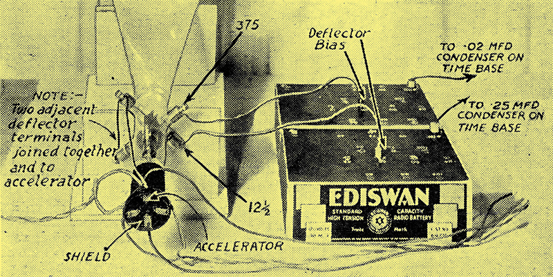 Several batteries in series will have to be used for the HT supply, to the cathode-ray tube and the bias connection is tapped off so that bias positive is common with HT negative. This reduces the risk of the bias connections coming out while LT is applied.