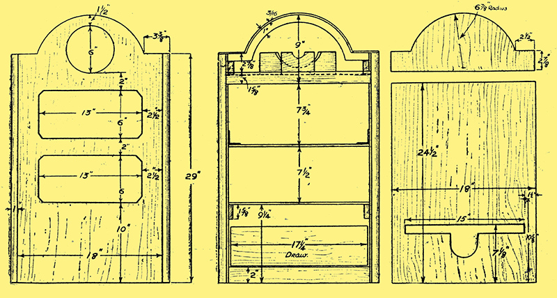 The construction of the cabinet should be commenced by cutting the four pieces for the base; these are two pieces 6 in × 18½ in × 1 in one piece 6 in × 17½ in × 1 in, and the remaining section, i.e. for the back, 2 in × 17½ in × 1 in.