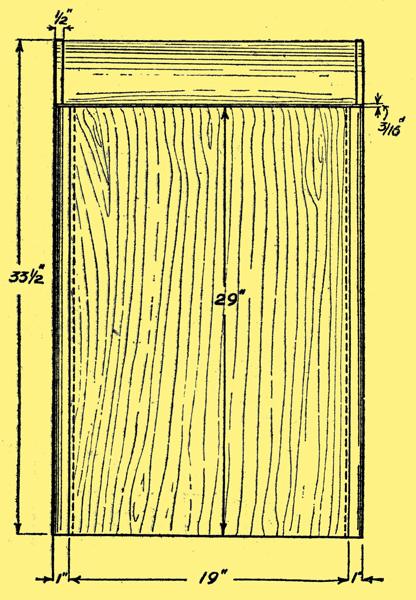 Before actually cutting the front and sides make quite certain that your particular dimensions in regard to height and width agree with those given for the various parts, since only a slight difference in the making of the skeleton will have resulted in a different height or width for the panels. The door of 4 mm ply at the rear of the cabinet is in two pieces, both of which are held in position by small leaf buttons.