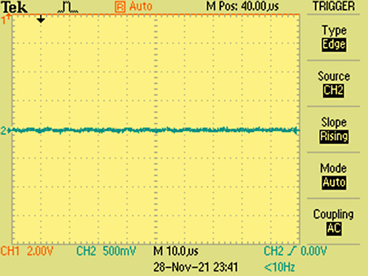 For comparison the voltage ripple from the Heathkit IP-47 HV stabilised bench power supply was measured also driving the amplifier at 255 Volts. As expected the trace was virtually noise free.