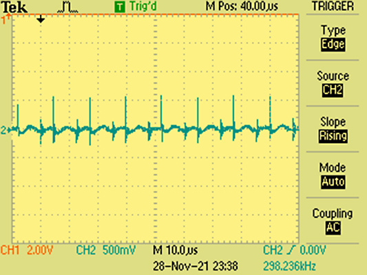 The above image shows the noise on the 255 Volt HT rail under load running the amplifier. The spikes are at more than ten times the frequency range of human hearing and have an amplitude of less than one Volt pk-pk. The amplifier is silent with no audio input.