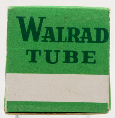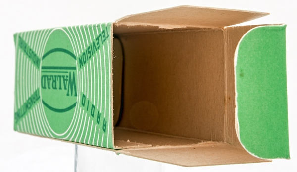 This box is a simple printed card box. The box has no valve Type printed on it and came to the museum empty. It is probable that originally the contents would have been wrapped in corrugated card with a greaseproof paper outer. The box is 38 mm square and 93 mm tall.