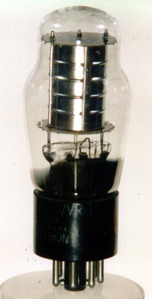 The VR150 is a gas filled discharge tube that exhibits a near constant voltage across the valve for currents within the range 5mA to 40mA. In fact the regulation is 150 plus or minus 5.5 Volts.The construction is of a central cold cathode within a cylindrical anode.The classic envelope is 38 mm in diameter and, excluding the IO base pins, is 88 mm tall.References: Data-sheet & 1040. |