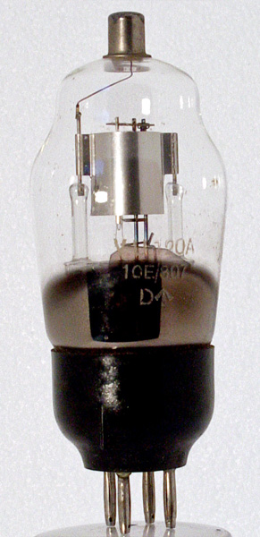 |  | The VU120A is an EHT rectifier with a cylindrical anode. The cathode runs vertically 6 mm from the anode wall, the top end of the cathode is connected to a plate and a stout wire passes back down inside the anode cavity. The heater is coated for insulation and four lengths are folded into the cathode tube and connected at the pinch end. The maximum reservoir capacitor is 0.25 µF, and the minimum series resistance is 10 kOhms.The classic envelope is 46 mm in diameter and, excluding the B4 pins is 109 mm tall. |