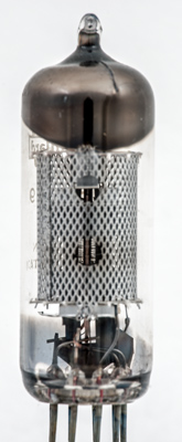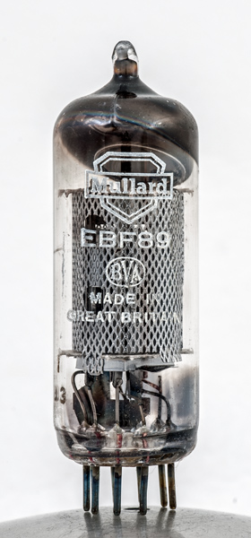Through the hole in the screen the three wire grids are visible. The cathode tube passes through a screen without any coating. Just below the top mica the tube is coated again and either side are the diode anodes.The thin glass tube envelope is 20 mm in diameter and, excluding the B9A base pins, is 59 mm tall.References: Data-sheet & 1040. Type EBF89 was first introduced in 1954. See also 1954 adverts. |