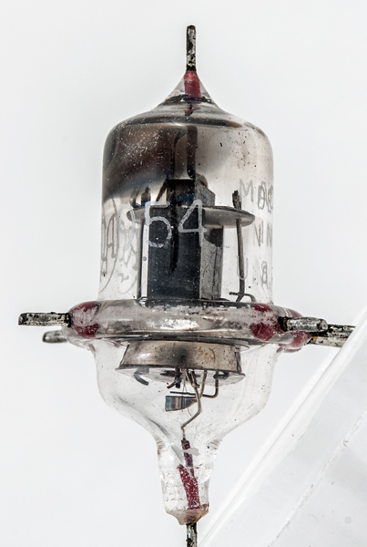 The 954 miniature all glass acorn valve is a pentode with a 6.3 Volt heater. Visual inspection shows the three grids within the anode cavity. In 1943 in America the 954 was re-worked onto the B7G base and issued as the 9001.