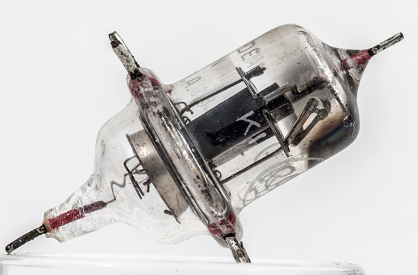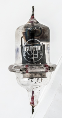 The control grid connection is at the lower left and emerges from the base. The anode connects to the top pin. Below the pin ring is the internal screen. The wording is Made in USA. K1 is the maker's code.