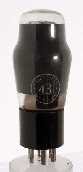 The 43 UX6 based audio output pentode is electrically identical to the IO based 25A6. The valve is rated for use in low power single ended output stages. This suggests that it was for use in the output stages of receivers.The classic envelope is 43 mm in diameter and, excluding the UX6 base pins, is 101 mm tall.References: Data-sheet, 1040 & 1043. Type 43 was first introduced in 1932. See also 1932 adverts. |