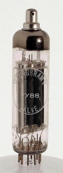 The PY88 is an efficiency diode for use in television line scan systems, where stored energy in the inductances is returned to the HT rail capacitors. The maximum peak inverse voltage (PIV) rating is 6,600 Volts. The peak anode current is 550 mA. These diodes require a very good heater cathode insulation and the PY88 is rated at 6,600 Volts.The thin glass tube envelope is 20 mm in diameter and, excluding the B9A base pins, is 76 mm tall.References: Data-sheet & 1040. Type PY88 was first introduced in 1958. See also 1958 adverts. |
