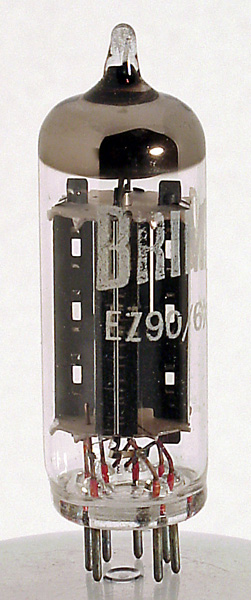 The EZ90 miniature HT rectifier follows the normal pattern for a full wave device in that a common cathode is employed.At 325-0-325 input to the rectifier this will give an HT rail higher than is required for most domestic receivers. Use for audio amplifiers and small transmitters is most probable, or driven at 250 volts for radio receivers.The central tubular cathode has two black anodes set at right angles to maximize heat transfer.See also 6X4 from Brimar. The 12X4 has the same rectifier characteristics but a 12 Volt heater and was designed for car radio use.The thin glass tube envelope is 18 mm in diameter and the length, excluding the B7G base pins, is 53 mm.References: Data-sheet & 1040. |