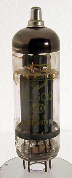 The PL500 is a purpose designed television pentode line output valve (sweep tube). It was later replaced by the PL504.The special feature of the PL500 was the introduction of the Cavitrap anode to reduce the ratio of screen grid to anode current. Although quoted as a pentode the construction is that of a beam tetrode.The peak anode voltage is quoted as 7,000 Volts and shows why the line output stage of a television receiver was the last consumer electronics product to remain a valve. The CRT excepted of course.TV line output valves found their way into amateur radio transmitters for service at HF (up to 30 MHz) because of their peak voltage characteristics and relatively high current capability.The wide glass tube envelope is 28 mm in diameter and excluding the B9D base pins, is 90 mm tall.References: Data-sheet & 1040. Type PL500 was first introduced in 1961. See also 1961 adverts. |
