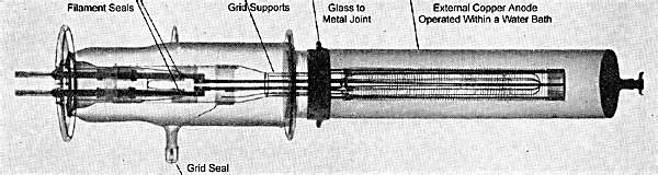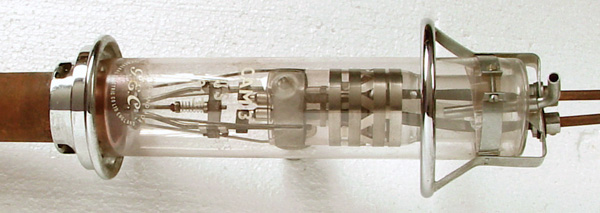 The valve has a glass to metal seal and the top of the copper anode can be seen inside the envelope. In use the anode was contained in a water jacket. The water used was purified to reduce electrical conductivity, and minimise hot-spots caused by the adherence of impurities to the anode.