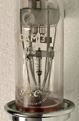 This magnificent valve is a cooled anode modulator. The CAM valves were developed from the CAT, cooled anode transmitter, valves of similar design. The CAM 3 being based on the CAT6 transmitting valve.