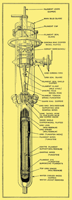 The close-up shows how these valves were constructed. The nuts and bolts testify to them being hand assembled. The re-entrant top provides an internal glass cylinder to hold the grid assembly. The rings at the top of the envelope and the top of the anode are anti-corona rings. A third such ring would have been mounted on the grid side contact.
