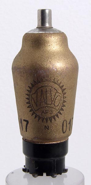 The AF3 is a variable-mu RF pentode. Operation under AGC control would have been in RF or IF amplifier service in superhet receivers.This AF3 from Valvo has a bright external gold metallic paint finish. The Ct8 base was much more popular in continental Europe than in the UK. The colour and the base suggest a 1930s design.The classic envelope is 41 mm in diameter and, excluding the Ct8 base pins, is 103 mm tall.References: Data-sheet. |