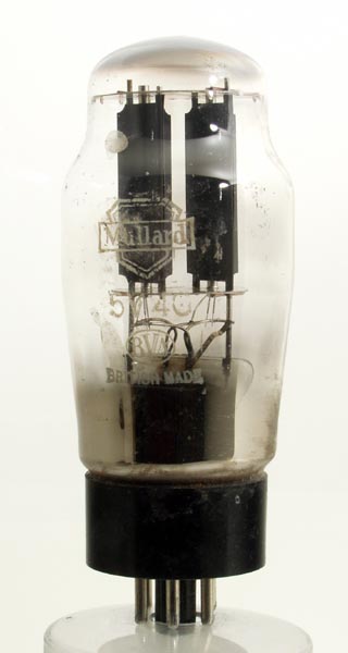The close-up picture shows the method of holding the two halves of the sheet metal anode by clamping lugs through the second plate.The classic envelope is 42 mm in diameter and, excluding the IO base pins, is 97 mm tall.References: Data-sheet, Data, 1040 & 1043. Type 5V4G was first introduced in 1937. See also 1937 adverts. |