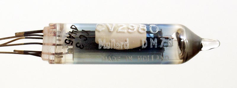 The DM70 is a miniature tuning indicator designed for dry battery operation. The valve is badged as a Mullard product but also as made in Holland. This implies that it was in fact a Philips designed and built device.The display changes from minimum to maximum for a 10 Volt change on the control grid.The following comes from a Mullard data-sheet.Battery receivers. The filament may be fed from a 1.4V battery or it may be connected in series with the filaments of other valves in the receiver, provision being made for a suitable shunting resistor if necessary. The operating conditions indicate which filament pin should be connected to the earthed side of the demodulator circuit.Mains receivers. The filament may be fed from a 6.3 V heater transformer provided it is connected in series with a 220Ω, 1 W, 5% resistor. If the heater transformer has a centre-tap giving 3.15 V, a series resistor of 82Ω, 0.5 W,10% may be used. If desired, the filament, shunted by a suitable resistor, may be included in a series heater chain provided it also includes a current limiting device. With either form of connection in mains-operated receivers, pin 5 must be connected to the earth side of the demodulation circuit for satisfactory operation.Construction etc. This valve is a triode in which the grid is in the form of a plate containing a tapered aperture. The anode is coated with fluorescent material which is viewed through the grid aperture. The length, L, of the fluorescent 'column' observed through the grid aperture decreases as the grid potential goes negative. The valve may be mounted in any position, the direction of viewing being indicated on the diagram of pin connections. Direct soldered connections to the leads of this valve must be at least 5 mm from the seal and any bending of the valve leads must be at least 1.5 mm from the seal.