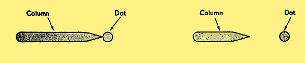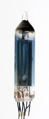 The left hand diagram shows the glowing column when the grid is at filament potential. The right hand diagram shows the effect of making the grid several volts negative of the filament.The thin glass tube envelope is 9 mm in diameter and, excluding the B8D base wires is 41 mm tall.References: Data-sheet, 1040 & 1043. Type DM70 was first introduced in 1952. See also 1952 adverts. |