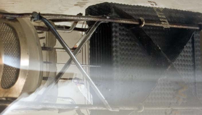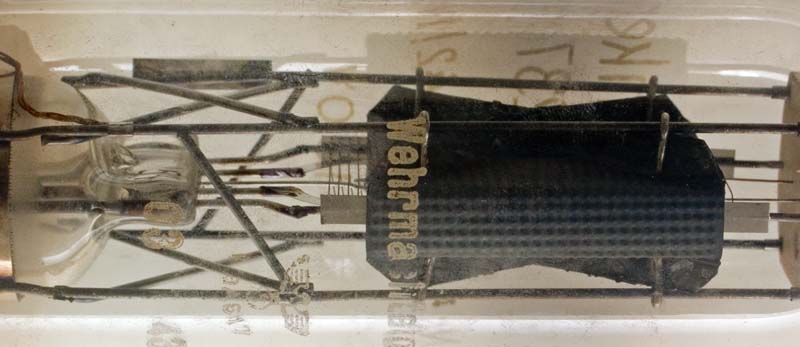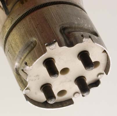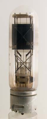 Here the detail of the anode can be clearly seen. On the broad face is a pair of diagonal webs for increased rigidity. The grid is shaped and made of robust wire, this would be required in a transmitter valve that operates in Class C and is required to pass grid current and thus dissipate some power.The supporting rods form a cross bracing. These features all point to a service life in mobile or airborne use.