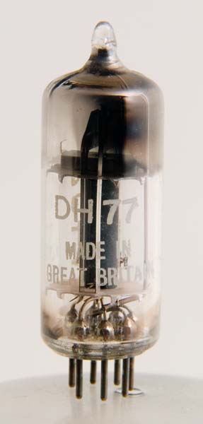The DH77 amplifier triode with twin signal diodes on a common cathode. It was designed for use in superhet receivers at the end of the IF chain and as the first audio amplifier feeding the output stage.The thin glass tube envelope is 17 mm in diameter and, excluding the B7G base pins, is 46 mm tall.References: Data-sheet, 3002 & 1040. Type DH77 was first introduced in 1950. See also 1950 adverts. |