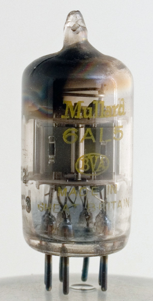 The two valves are completely separate flat structures separated by a plate screen. This clearly shows the signal usage, where it is important to keep RF isolation.These double diodes were designed for sound and vision detection in 405 line televisions. Additionally they are recommended for limiting and DC restoration, again part of a TV receiver functionality.The thin glass tube envelope is 17 mm in diameter and, excluding the B7G base pins, is 37 mm tall.References: Data-sheet & 1040. Type 6AL5 was first introduced in 1945. See also 1945 adverts. |