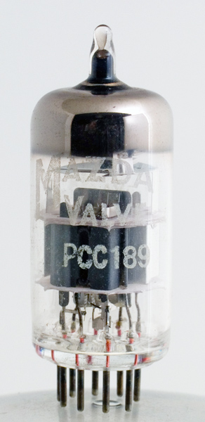 The PCC189 is a low impedance high gain double triode. The technical specification specifically states that it is built with frame grids. The valves are variable μ types for use at RF as AGC controlled devices. The low voltage high current suggests a low noise design, probably as the front end stages in a television tuner. The low anode voltage suggests both stages used as a cascode (series connected) amplifier.See PCC88 for the single μ or straight version.