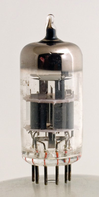 The triode sections appear as separate structures. The anode is significantly larger than is found in most double triodes. The size and the blackening of the anode all point to these being run at significant current.The thin glass tube envelope is 20 mm in diameter and excluding the B9A base pins it measures 46 mm long.References: Data-sheet & 1040. Type PCC189 was first introduced in 1960. See also 1960 adverts. |
