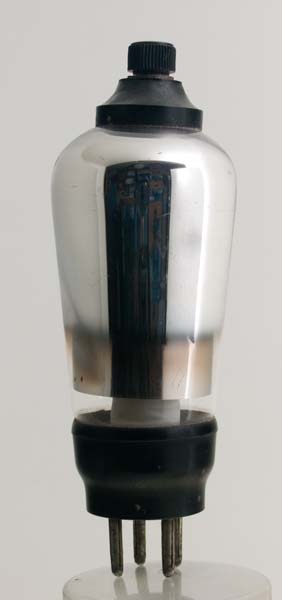 The other side of the envelope is not silvered and the electrodes are visible. Note the rectangular anode and concentric grids whilst still having the Bakelite top cap assembly of the early 1930s.The balloon envelope is 42 mm in diameter, and excluding the B4 base pins is 110 mm tall.References: Data-sheet & 1040. Type 215SG was first introduced in 1929. See also 1929  adverts. |